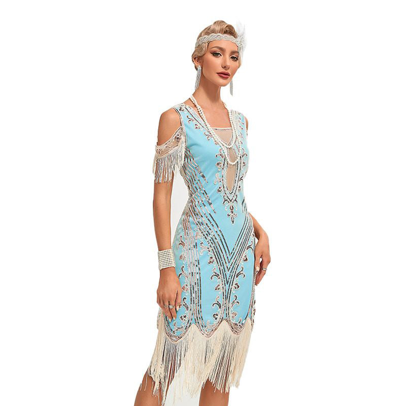 Women's Short Sleeve Sequin Mesh Patchwork Fringe Hem Cocktail 1920s Gatsby Dress